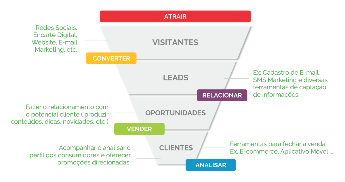 Para ficar bem claro, o funil de vendas é um processo que consiste em conduzir ou acompanhar o cliente a partir do momento em que ele toma conhecimento de uma solução vendida pela sua empresa até o fechamento do negócio. Ou seja, o funil mostra cada etapa seguida pelo consumidor, desde o momento em que ele descobre ou reconhece sua necessidade, e assim demonstra o desejo pela compra, até a efetivação da aquisição em si. O funil mostra, por exemplo, a pesquisa feita pelo cliente em relação ao produto/serviço ou a empresa, e o contato inicial. Conhecer estas etapas facilita a produção de conteúdo, e informação útil aos clientes, conforme cada etapa em que eles se encontram.